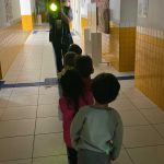 As crianças brincam de atravessar na faixa, parando no “Pare” e respeitando o semáforo.