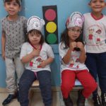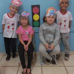 Apresentação e execução de uma folha de atividades aonde se via duas cenas alusivas ao trânsito e chegamos num consenso de qual era a correta e qual deveria ser pintada; pintura de semáforos com as cores a que se refere cada ação ligada aquela cor correspondente ao que era pedido na atividade.