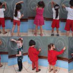 A Letra vazada se tornava uma rua, uma pista, uma estrada, enfim, o que a imaginação pudesse dizer. Quando, na música, se dizia “sinal vermelho, parou”, a criança deveria parar o carrinho. E seguia conforme a continuidade da música. Fizemos de diferentes formas a brincadeira, tanto no plano vertical, como no horizontal, onde a letra foi desenhada no chão. Além de fazer com a própria mão, as crianças foram desafiadas a empurrarem com o próprio pé o carrinho, com cabo de vassoura, entre outras maneiras que foram sendo criadas até por elas mesmas.