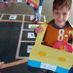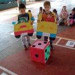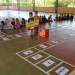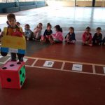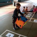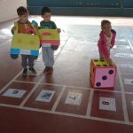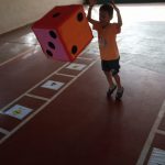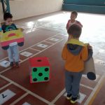 Os alunos utilizaram o dado para verificar a pontuação e poder se locomover na trilha com o “carrinho”. Ganha a brincadeira quem terminar o percurso primeiro.