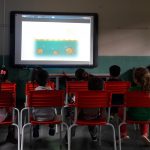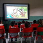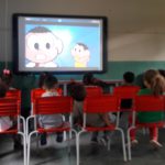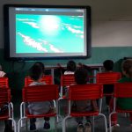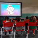 Durante o filme foi a professora  algumas intervenções a fim de chamar a tenção das crianças para as atitudes positivas que devemos ter em relação ao meio ambiente.