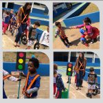 Os alunos iniciaram as atividades participando de uma roda da conversa sobre o trânsito. Fizemos um resgate com as crianças, nomeando elementos que compõe o trânsito, as placas, a sinalização, os tipos de veículos, do comportamento necessário para trafegar os veículos, sendo motorista ou passageiro, e fora deles, sendo o pedestre.