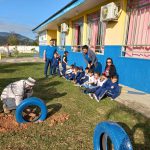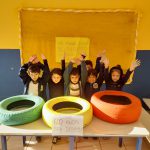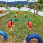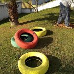 Os pneus que estavam jogados em frente da escola, os monitores pegaram, pintamos e mostramos para as crianças que esse pneus demoraria 600 anos para se decompor, deixando à natureza feia e triste. Em nossa escola plantamos cheiro verde, alface, couve e até na postagem anterior colhemos para ser fornecido na merenda da escola e dessa vez fizemos um circuito com pneus para trabalhar atividades sobre lateralidade e coordenação motora.