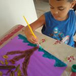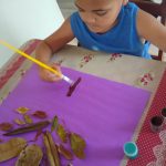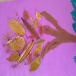 O trabalho foi realizado usando tintas, folhas secas, color set e cola.