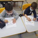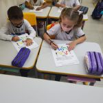 A professora fez a leitura das comandas pedindo aos alunos que utilizassem a cor correta de lápis de cor para levar a abelhinha a cada flor.