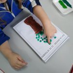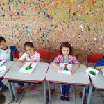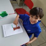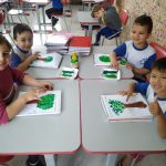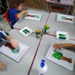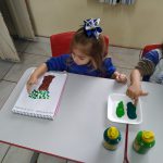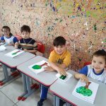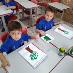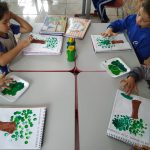 Cada aluno criou a sua árvore, primeiramente pintando o tronco com pincel e tinta e depois usando um dedo para fazer as folhas e o seu formato.