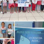 DESENVOLVIMENTO: Para celebrarmos o dia da água, contamos a história demonstrando o ciclo da água (livro: Juju vai viajar), realizamos uma roda de conversa para falarmos sobre os cuidados com a qualidade da água e com a economia dela, proporcionando a eles mais um momento de aprendizado. Tratando sobre o tema, cada um pode falar o que pode fazer para cuidar de nossa água.