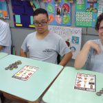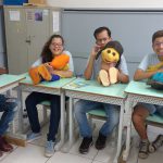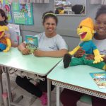 Alunos felizes ao escutar a história em quadrinhos e utilizarem os bonecos (fantoches)