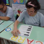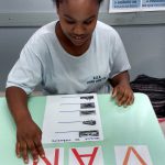 Aluna Gabriela também montando a escrita com letras móveis, após aula expositiva sobre os cuidados no trânsito