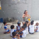 Ainda na rodinha comentei com a turma que iria apresentar vídeos e algumas imagens muito importantes para a vida deles e que eles precisavam assistir com atenção para agirem de maneira adequada e ensinarem suas famílias em casa, objetivando a criação de uma consciência de cuidado e responsabilidade com o meio ambiente, desde a infância.
