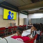 Os alunos assistiram aos vídeos sobre histórias de trânsito com a turminha da arteris e depois fizeram uma roda conversa para debater sobre as aprendizagens dos vídeos