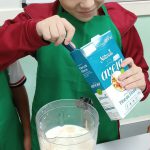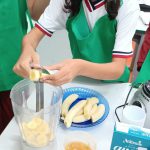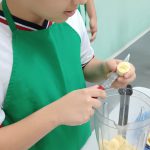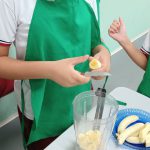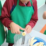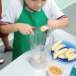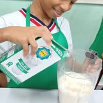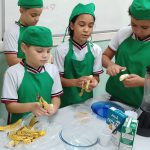 A turma do quinto ano A da professora Selma realizaram um experimento com uso da fruta banana. Os estudantes foram repertoriados com o gênero textual receitas na qual conheceram os ingredientes e benefícios na vitamina de banana. Como mão na massa os mesmos fizeram uso dos equipamentos de cozinha, gorro e avental e puderam, de forma coletiva e colaborativa produzir a vitamina.