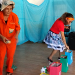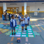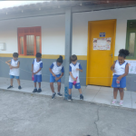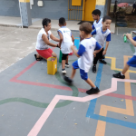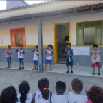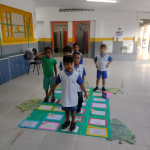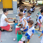 Dando continuidade à aula, desenvolvi as seguintes propostas: confeccionei com os alunos um cartaz coletivo com o planeta terra, mostrei os copinhos da reciclagem e expliquei que tipos de lixo devem ser colocados em cada um e a importância de estarmos separando e descartando o nosso lixo adequadamente. Depois fiz a brincadeira “separando o lixo”, onde será colocado de um lado os copinhos com os símbolos da reciclagem e do outro lado diversas imagens de tipos de lixos diferentes que deveram ser separados de acordo com o material que foram produzidos. Dinâmica do mundinho, na caixa surpresa. Em seguida realizei com os alunos a Brincadeira da reciclagem catando catando – a turma será organizada em grupos e cada grupo ao sinal da professora e ao som da música reciclagem (paródia da música patinho colorido) deverá catar os vários tipos de lixo que estarão espalhados pelo chão e colocar cada um na sua cestinha corresponde, de acordo com o material que foram produzidos.