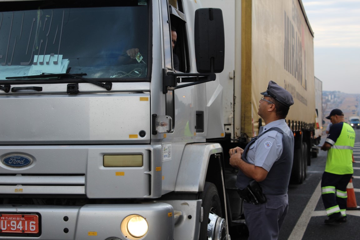 São verificados pelo Policiamento Rodoviário itens como, condição dos pneus; freios; Vazamentos visíveis; Barra de direção; Iluminação traseira; Documentação da carga e tacógrafo por exemplo.