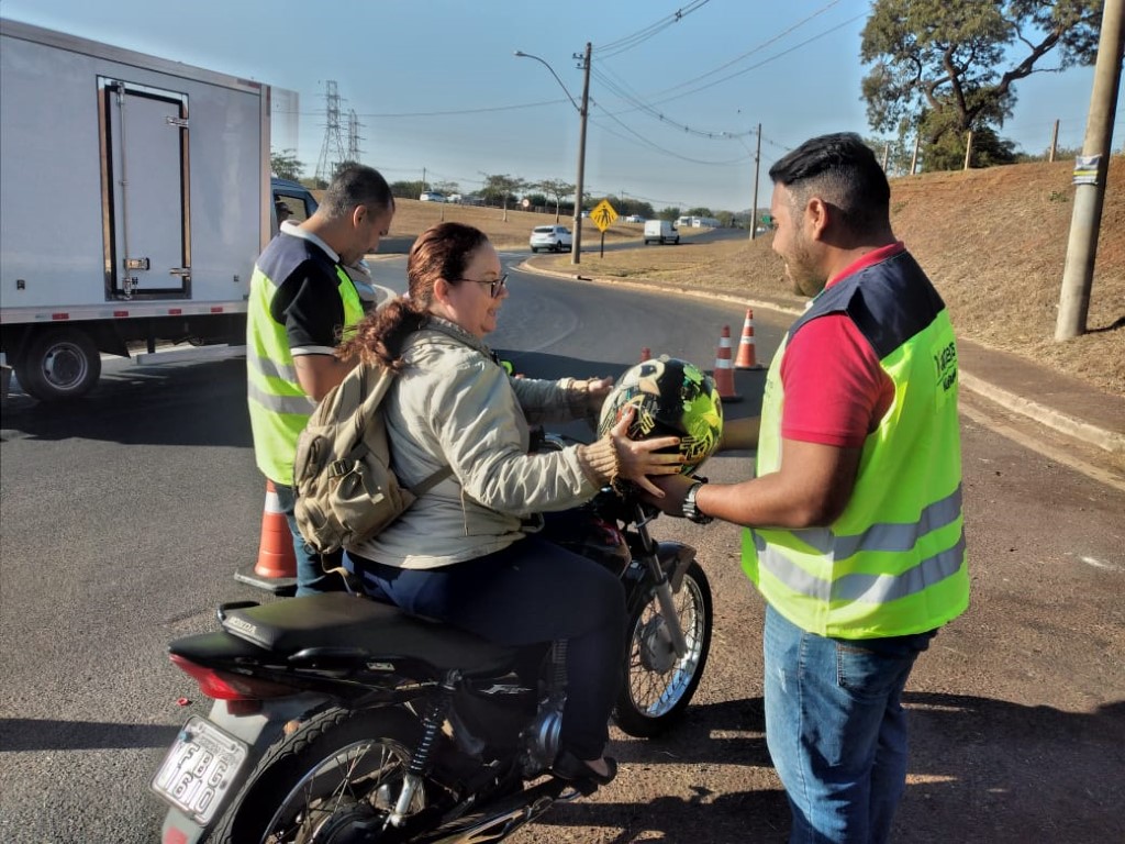 equipes da concessionária e PMRV abordam e orientam motociclistas sobre comportamento e segurança no trânsito além de entregar folhetos educativos e realizar limpeza dos capacetes e viseiras.